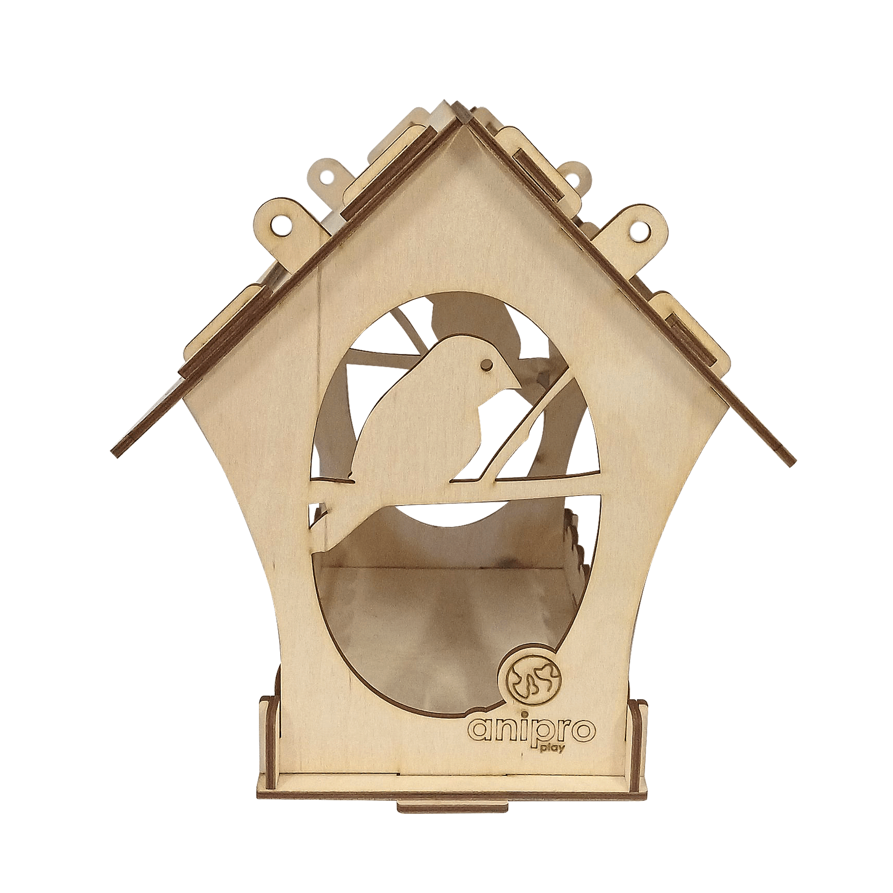 anipro дървена хранилка за птици е привлекателно кътче за хранене на малки диви птици, които искате да привлечете близо до вашия дом, градина, парк. Специално създадена за типичните горски и градски пернати обитатели – червеношийки, синигери, скорци, врабчета и други. С anipro дървена хранилка за птици природата е по-близо до вас! Отличен подарък за любители на природата във всяка възраст: anipro дървена хранилка за птици е подходяща като за деца, така и за възрастни. Създадена от лесно сглобяеми модули, построяването и монтирането на хранилката е приятно семейно занимание. Подходяща за оцветяване: материалът на хранилката за птици позволява да бъде оцветявана и изрисувана с акрилни и темперни бои, както и моливи. Декорирайте, изчакайте да изсъхнат за една нощ и монтирайте. Безопасна за деца: без дребни части, без опасност от поглъщане, без метални болтове и други снадки, без лепила. Майсторска изработка: 100% естествен плътен и материал ( брезов шперплат), прецизно изрязани модули без дребни части и с качествена обработка за приятни на допир загладени ръбове. Лесна за поддръжка: дървената хранилка за птици е с дизайн, който позволява лесно разглобяване, отваряне и почистване, при желание. В този случай, препоръката е да не се използват никакви препарати, а само гореща вода. За външни условия: предвидени за окачване в градината, в гората, в парка, както и в апартаменти с тераси в големия град. Лесно достъпна за птиците от всяка една страна Удобна и лесна за монтаж: Сглобяването не изисква никакви метални части ( без болтове, нитове, без бормашини или друга специализирана техника ). Създадена за висящо окачване чрез специално създадените за целта перфорирани елементи върху покрива. За окачването можете да използвате различни видове подръчни материали – връв, месина, въже. Атрактивен дизайн за птиците и за техните любители: Семпъл автентичен кубичен дизайн, в който няма нищо излишно. Изчистени линии за висока декоративна стойност. Истинско бижу за Вашата градина, парк, балкон. Материалът позволява да декорирате собственоръчно с цветни бои или моливи. Комплектът включва: Съставни части от брезов шперплат Инструкции за сглобяване Съвети за употреба: Хранене – поставете в хранилката подходяща храна за птици ( напр. специализирана суха храна от ларви, семена, ядки, плодове). Място: закачете на дърво в парка, в градината, в гората, на балкона Височина: най-подходящата височина на окачване между 2-4 м Изложение: най-подходяща ориентация на входа – с отвора на север или североизток и на място, което не се огрява пряко от слънце. Добре е да съобразите входа така, че да не е срещу посоката на преобладаващите ветрове. Сигурност: къщичките и хранилките да се окачват на място, недостъпно за котки и други хищници Съседни площи: не е препоръчително да окачвате в близост една до друга къщичка и хранилка. Птиците търсят уединение, далеч от струпването на много птици от различни видове. Удобство: уверете се, че по пътя на птиците към хранилката няма пречки, които да затрудняват полета им Поддръжка: при желание, можете да разглобите хранилката, да почистите и да дезинфекцирате с гореща вода. Не използвайте препарати! Цвят: естествен дървесен цвят на бреза Материал: 4мм шперплат от бреза, импрегниран Произведена в ЕС