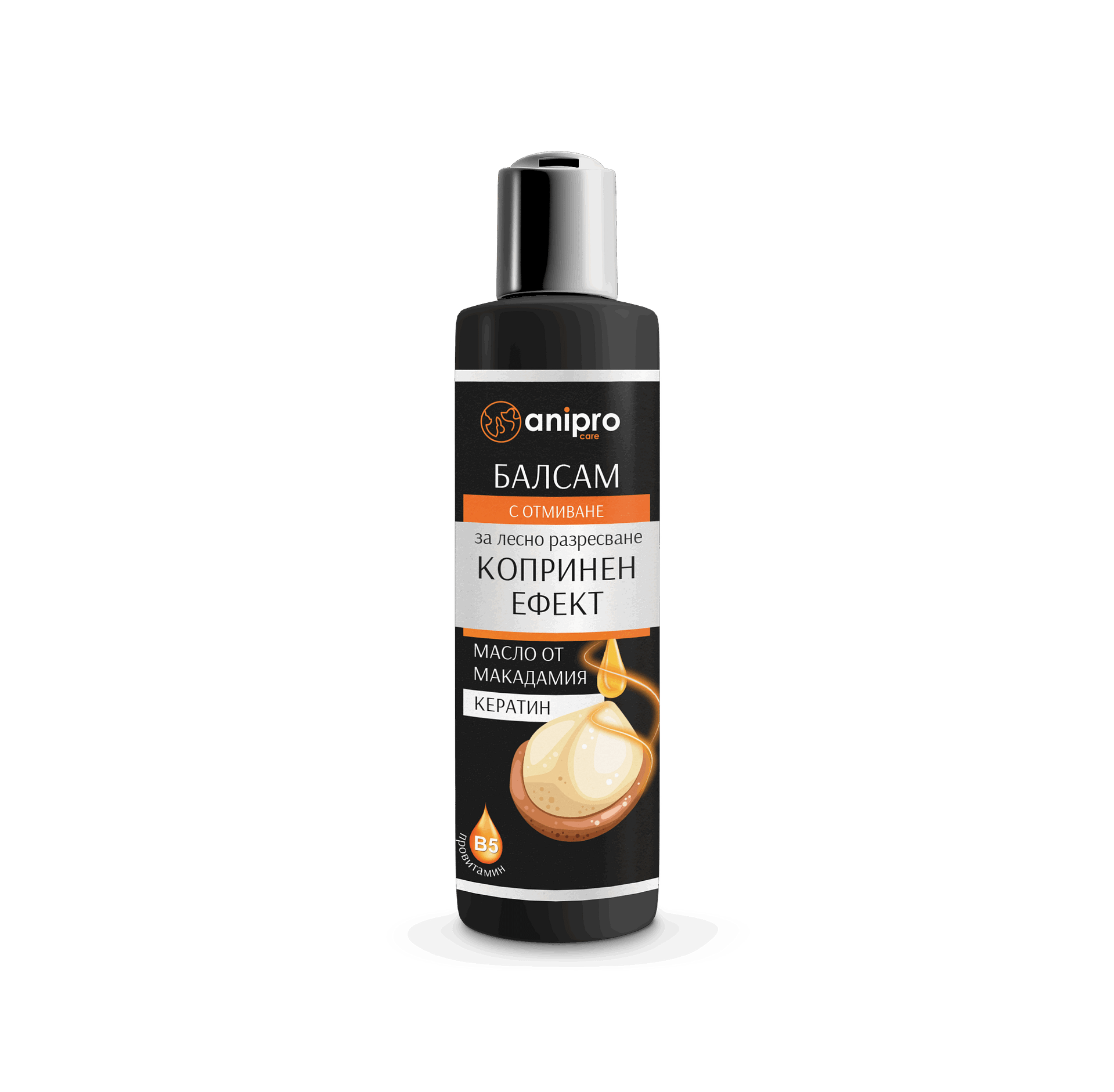 anipro Lux балсам за куче, копринен ефект е луксозен балсам с отмиване за лесно разресване. С добавен Хидролизиран Кератин към формулата с Макадамия и Провитамин В5 за още по-интензивно възстановяване на косъма. Козината е лъскава и подхранена по цялата дължина, мека и лесна за разресване, без заплитане. Кучето се чувства по-комфортно. · Без алергени · Без оцветители · Без силикони · Без парабени · Без съставки от животински произход Употреба: Измийте козината с шампоан. Според породата, разнесете 15-30 ml балсам равномерно на мокра козина. Оставете 2-3 мин. Изплакнете. Пазете очите и ушите. Опаковка: 200 мл. в бутилка от 100% рециклирана пластмаса с дискова капачка, което прави нанасянето на шампоана лесно и удобно с една ръка, докато с другата държите домашния ви любимец. Създаден с любов и грижа към домашните любимци и околната среда. серията anipro care LUX предлага 3 вида шампоан, балсам и маска без отмиване: anipro Lux шампоан за куче, дълбокахидратация 200 мл · anipro Lux шампоан за куче, спокойна кожа200 мл · anipro Lux шампоан за куче, копринен ефект200 мл · anipro Lux балсам за куче, копринен ефект200 мл · anipro Lux маска за куче, копринен ефект200 мл Произведени за МиаЗоо от висококачествени натурални съставки. Предназначени само за животни. Състав: Aqua, Cetearyl Alcohol, Cetrimonium Chloride, Macadamia Ternifolia Seed Oil, Hydrolyzed Keratin, Panthenol, C12-15 Alkyl Benzoate, PEG-7 Glyceryl Cocoate, Amodimethicone, Trideceth-12, Polyquaternium-39, Parfum, 2-Bromo-2-Nitropropane-1.3 Diol, Coumarin, BHT. РН 3,5-5,5.