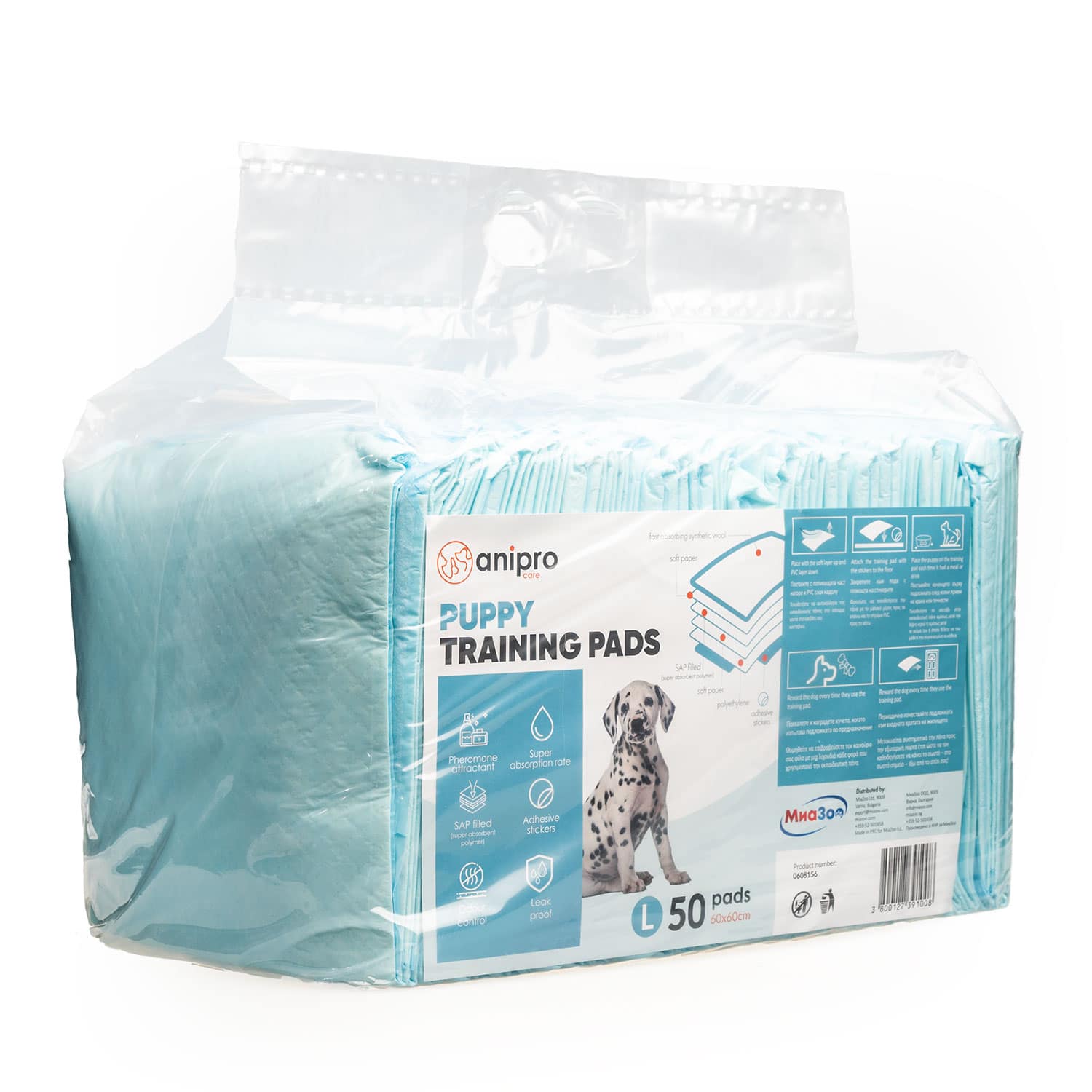 anipro Puppy Pads – хигиенни подложки (памперси) създадени за приучаване на малки кученца към хигиенни навици. Подходящи и за болни или възрастни кучета. Лесно се закрепват къмвсяка подова повърхност у дома – ламинати, теракота и др. Идеални за употреба по време на път – за транспортни чанти, седалки в кола, легла и др. 5-слоен състав за бързо попиване, мекота и неутрализиране на миризми. Качество във всеки слой: 1-ви слой – Бързо попиваща вата от нетъкан текстил. Ефективно предотвратява разливането; 2-ри слой – Мека хартия. Съдържа феромони и привлича кучето къмподложката; 3-ти слой – S.A.P. (Супер Абсорбиращ Полимер) незабавно превръщатечностите в гел. Предотвратява разливане. Неутрализира неприятни миризми; 4-ри слой – Мека хартия за допълнителна изолация; 5-ти слой – Полиетиленов филм: защитава повърхностите от намокряне изацапване; Със стикери за всяка страна на хигиенната подложка за лесно и здравозакрепяне към различни повърхности. Инструкция за употреба при малки кученца: Закрепете пелената с лепенките към пода в близост до леглото на кученцето. Уверете се, че поставяте пелената с попиващата част нагоре. Добавените феромони ще стимулират вашия нов приятел да използва пелената. След хранене или пиене на вода поставете кученцето веднага върху нея, като не забравяте да го похвалите и наградите с лакомство, ако се изходи там. Периодично измествайте пелената към врата на жилището, за да го насочите да пишка навън. Погалете и наградете, ако се изходи навън. Размер: 60х60 см Наличен в опаковка: 10 бр в пакет 50 бр в пакет Важно: Опаковката е изцяло биоразградима и компостируема. Пазете опаковката далеч от малки деца и животни!