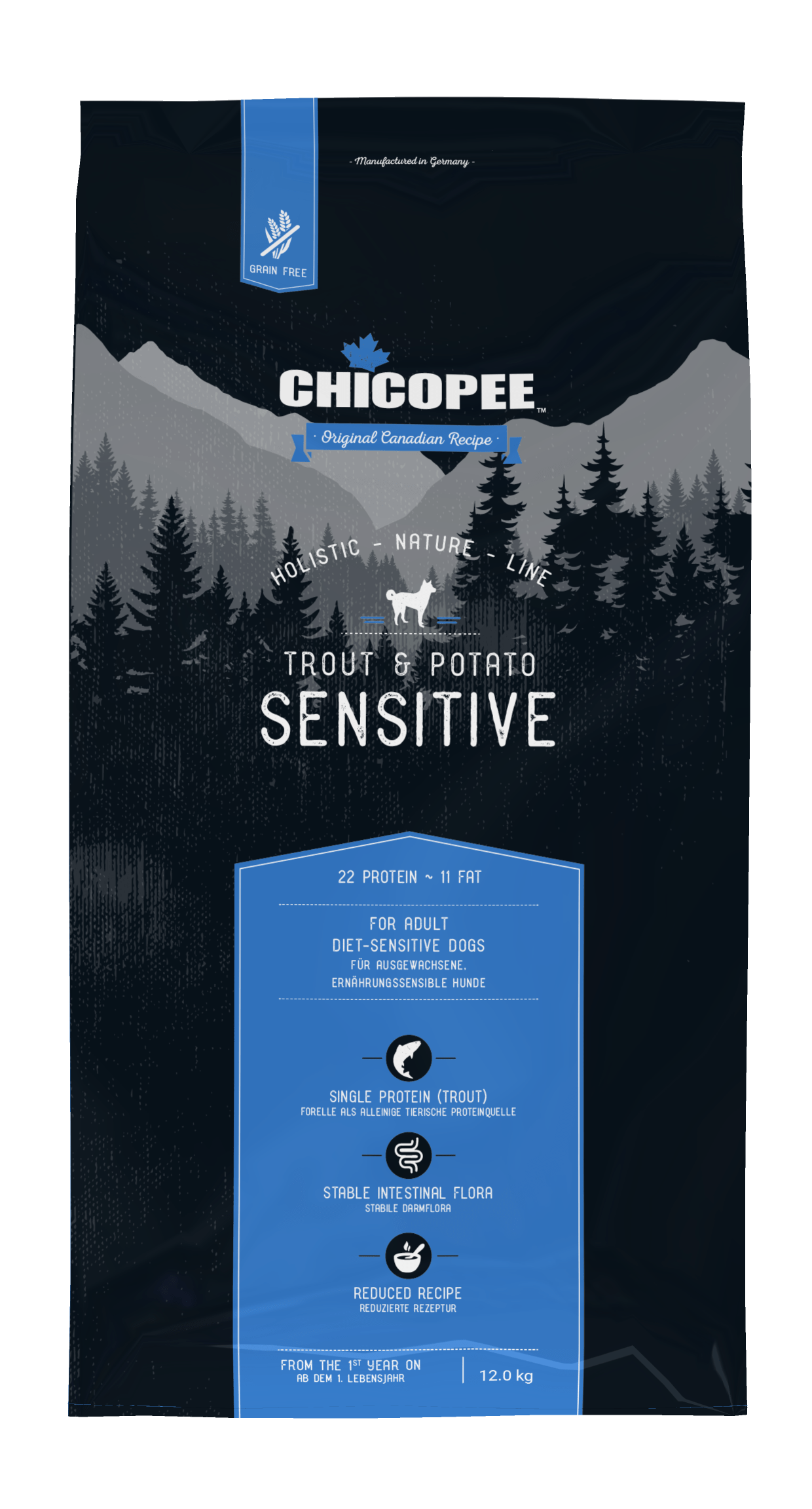 Chicopee Dog Holistic Nature Line Sensitive за кучета с прясна пъстърва и картофи е пълноценна суха храна за израснали кучета над 1 година от всички породи с чувствителен храносмилателен тракт. Основни предимства: · БЕЗ зърно · Монопротеин · Стабилна чревна флора СЪСТАВ: Картофи (дехидратирани, 45 %), прясна пъстърва (12,5 %), пъстърва на прах (12,5 %), … Продължете с четенето на Chicopee Dog HNL Sensitive за кучета с чувствителен стомах, пъстърва и картофи, 12кг
