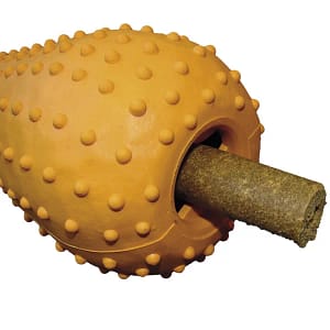 Плътната гума е много здрав материал, който осигурява дългосрочно удоволствие от играта. Тази играчка е гъвкава и се използва за грижа за зъбите и удоволствие от дъвченето. Отворите, които могат да се пълнят с лакомства, насърчават независимата дейност и правят играчката особено вълнуваща за вашето куче.