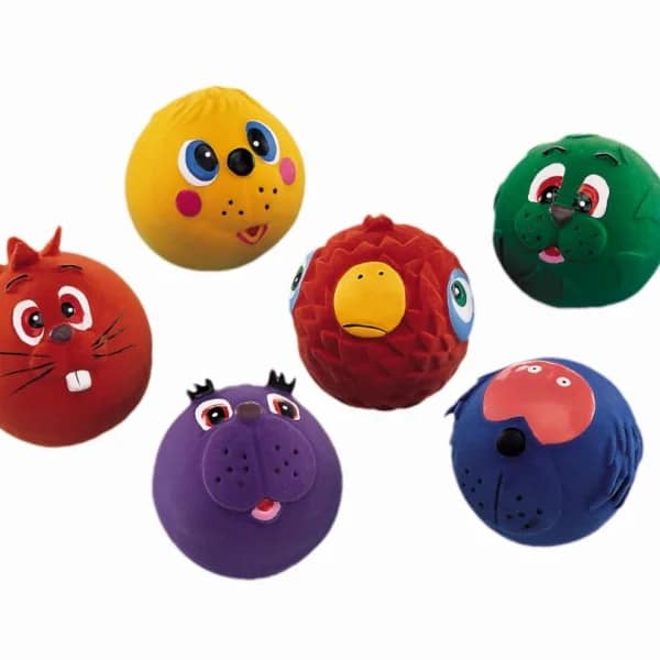 Тази латексова играчка се предлага под формата на кръгли глави на животни в различни цветове. Те са високи 7 см и са оборудвани с глас.
