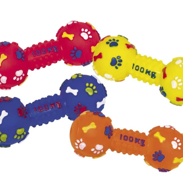 Виниловата играчка се предлага под формата на дъмбел „100 кг“ с писклив и в четири различни цвята. Размер: 14 см