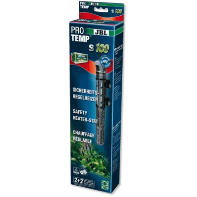 JBL ProTemp S 100W – Нагревател със защитна кошница – 50-160l -27,5см. Със защитна пластмасова решетка. Защитен ключ ( включва се, ако нагревателят остане на сухо). 2мм защитно кварцово стъкло. Висока точност на контролаІ +/- 0,5 ºС. Звездовиден нагряващ елемент, изработен от керамика, за оптимално разпределяне на температурата. Голяма скала за избор на температурата. Удобен и компактен модел. Изцяло подводен. Температурен обхват от 20 до 34ºС. 2м захранващ кабел.