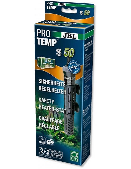 JBL ProTemp S 50W – Нагревател със защитна кошница – 50W- 21см. Със защитна пластмасова решетка. Защитен ключ ( включва се, ако нагревателят остане на сухо). 2мм защитно кварцово стъкло. Висока точност на контролаІ +/- 0,5 ºС. Звездовиден нагряващ елемент, изработен от керамика, за оптимално разпределяне на температурата. Голяма скала за избор на температурата. Удобен и компактен модел. Изцяло подводен. Температурен обхват от 20 до 34ºС. 2м захранващ кабел.