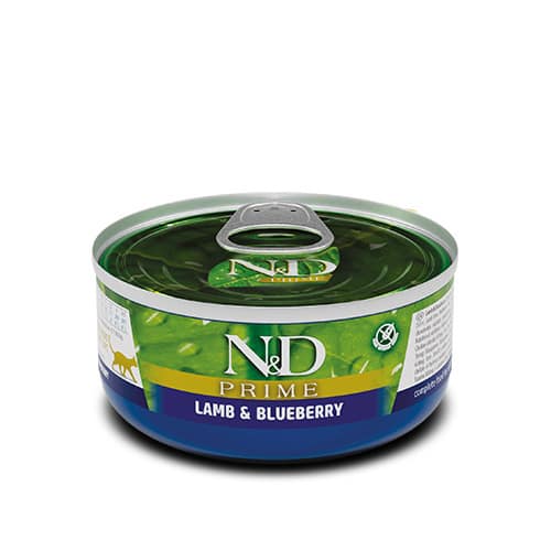 N&D Prime Cat Lamb & Blueberry в консерва е пълноценна мокра храна без зърнени култури за котки в зряла възраст, с агнешко и боровинки, формулирана така, че да отговаря на хранителните нива, установени от AAFCO в хранителните профили за храни за ежедневно хранене на здрави котки.