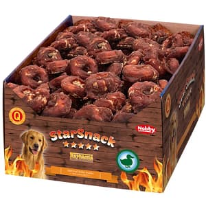 StarSnacks Barbecue Wrapped Duck са прекрасно лакомство за всички кучета по всяко време. Изработени са от естествени суровини и работят като естествена четка за зъби. Триенето при дъвчене разхлабва зъбния камък и така го намалява. Нискомаслените пръчици за дъвчене с 3,5% мазнина са направени от 50% естествена телешка кожа и са обвити с 42% сушено патешко месо. Като обилна малка закуска или като награда след спорт и игра, те поддържат естественото удоволствие от дъвченето на вашето куче.