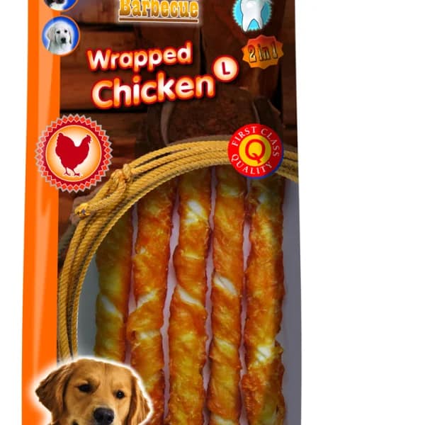 StarSnack Chicken Treats е чудесно лакомство за всички кучета. Те са направени от естествени суровини и затова са много популярни. Доставят се в запечатана прясна торбичка. „Wrapped Chicken“ се състои от 45,5% пиле, 50,2% телешка кожа и само 2% мазнина! Тази версия е особено подходяща за големи кучета!