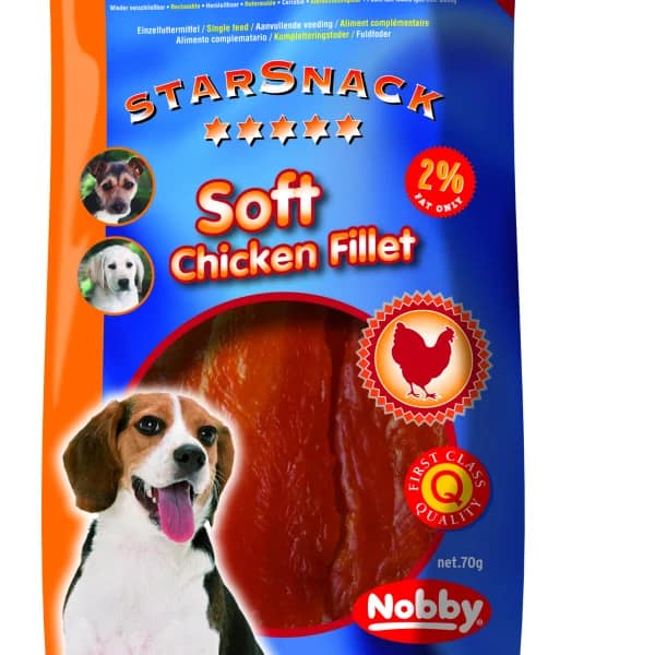 StarSnack SOFT CHICKEN FILLET е чудесно лакомство за всички кучета. Те са направени от естествени суровини и затова са много популярни. Доставят се в запечатана прясна торбичка. „SOFT CHICKEN FILLET“ се състои от 83% пиле и само 2,0% мазнини!
