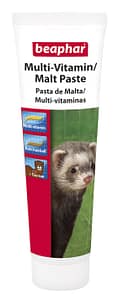 Две важни за домашното порче съставки в един продукт – витамини + Таурин и малц – Beaphar Vitamin/Malt Paste. Състои се от два слоя: ЖЪЛТ – съдържа ценнив витамини и микроелемени, и жизнено важния Таурин. Порчетата, както и котките не могат да синтезират този витамин и за това те трябва да си го набавят, чрез храни и добавки. КАФЯВ – съдържа малц, благодарение на който космите натрупани в стомаха на порчето докато то се ближе, се изхвърлят лесно и безпроблемно по естествен път. Съдържание на витамини: витамин В1 – 395мг/кг; витамин В2 – 115 мг; калциев пантотенат – 125мг/кг; ниацинамид – 995 мг/кг; Витамин В6 – 115 мг/кг; витамин В12 – 780 мг/кг, фолиева киселина – 22 мг/кг; Биотин 2400 мг/кг; Витамин E – 160 мг/кг; Таурин – 4425 мг/кг. Мананолигозахариди за подпомагане на чревната функция – 4650 мг/кг За здраво и жизнено домашно порче с лъскава и гладка козина!