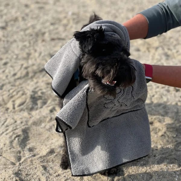 Задължително при всяко къпане! Тази микрофибърна кърпа е бързосъхнеща и изключително абсорбираща течности, но не и миризми. Абсорбира добре влагата и мръсотията, има практични отвори за ръце и може да се пере до 30°C. Сиво и с размери 100 х 50 см. Подходящ и за котки!