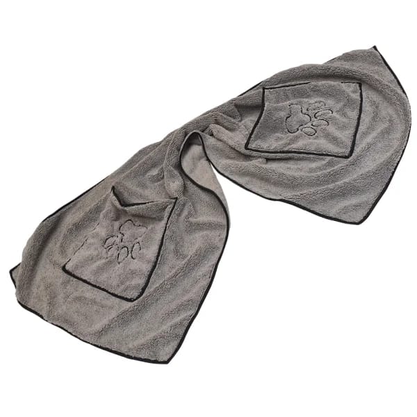 Задължително при всяко къпане! Тази микрофибърна кърпа е бързосъхнеща и изключително абсорбираща течности, но не и миризми. Абсорбира добре влагата и мръсотията, има практични отвори за ръце и може да се пере до 30°C. Сиво и с размери 100 х 50 см. Подходящ и за котки!