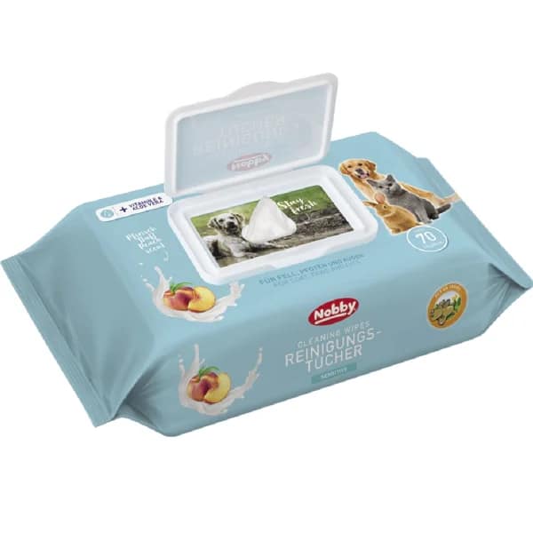 Нежните почистващи кърпички от Nobby са идеални за излети и пътувания. Подходящи са за бързо и нежно почистване на козината, лапите и кожата, както и за чувствителни зони като очи и уши. Кърпичките са особено нежни поради съдържащите се витамин Е и екстракт от алое вера и са с приятен аромат на праскова. Подходящи са за кучета, котки и малки животни и се предлагат в различни размери на опаковката.