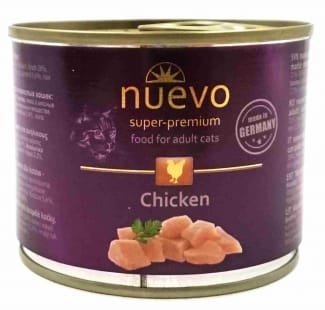 Тази консерва е богата на пилешко месо 71% – източник на ценен протеин. Перфекто задоволява нуждита на котки с чувтвителен стомах, само прясно месо комбинирано с есенциални витамини и минерали. Нуево с „Пиле“ е превъзходен източник на енергия, лесно усвоима и невероятно вкусна.