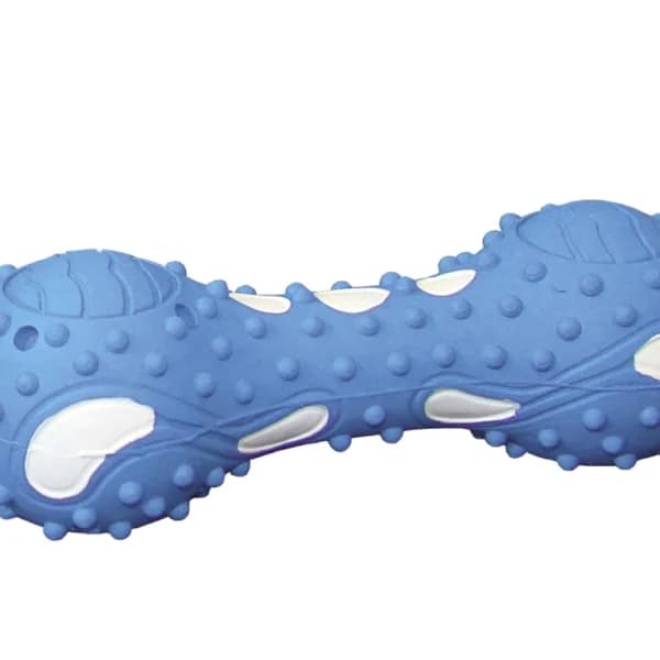 Тази охлаждаща играчка е изработена от плътна гума и е подходяща за замразяване. Дъмбелът може да се напълни с вода и да се замрази, охлаждайки кучето, особено в горещите дни. При дъвчене водата излиза през фините отвори. Затварянето може да се отвори и извади с остър предмет. Със своите назъбвания дъмбелът осигурява интензивна грижа за зъбите на вашето куче и в същото време му предлага специално удоволствие от дъвченето. Плътната гума е много здрав материал, който осигурява дългосрочно удоволствие от играта.