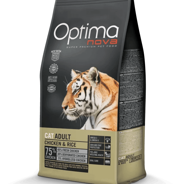 OPTIMA NOVA CAT Adult Chicken&Rise (пиле и ориз) 75% месо Хипоалергична, Суперпремуим храна за СРЕДНО АКТИВНИ котки от всички породи
