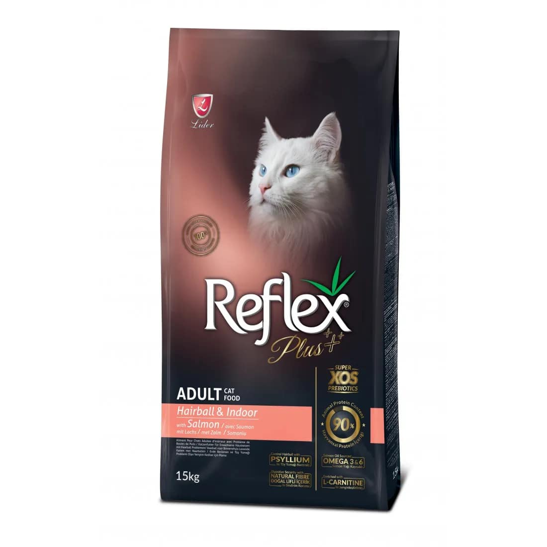 Reflex Plus Hairball & Indoor Adult Cat Food Salmon – Пълноценна храна за израснали дългокосмести котки със сьомга 15 кг