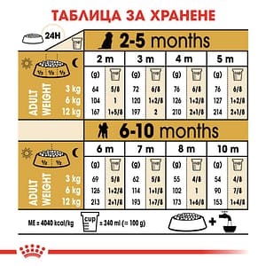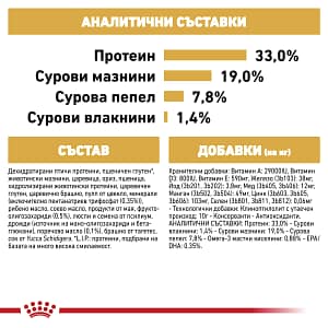 СЪСТАВ: дехидратирани птичи протеини, пшеничен глутен*, животински мазнини, царевица, ориз, пшеница, хидролизирани животински протеини, царевичен глутен, царевично брашно, пулп от цвекло, минерали (включително пентанатриев трифосфат (0,35%)), рибено масло, соево масло, продукти от мая, фрукто-олигозахариди (0,5%), люспи и семена от псилиум, дрожди (източник на мано-олигозахариди и бета-гликани), поречово масло (0,1%), брашно от тагетес, cок от Yucca Schidigera. ДОБАВКИ (на кг): Хранителни добавки: Витамин A: 29000IU, Витамин D3: 800IU, Витамин E: 590мг, Желязо (3b103): 38мг, Йод (3b201, 3b202): 3,8мг, Мед (3b405, 3b406): 12мг, Манган (3b502, 3b504): 49мг, Цинк (3b603, 3b605, 3b606): 103мг, Селен (3b801, 3b811, 3b812): 0,06мг – Технологични добавки: Клиноптилолит с утаечен произход: 10г – Консерванти – Антиоксиданти. АНАЛИТИЧНИ СЪСТАВКИ: Протеин: 33,0% – Сурови влакнини: 1,4% – Сурови мазнини: 19,0% – Сурова пепел: 7,8% – Омега-3 мастни киселини: 0,88% – EPA/DHA: 0,35%. УКАЗАНИЯ ЗА ХРАНЕНЕ: виж таблицата. За партидния номер, идентификационния номер: вижте на опаковката. Най-добър преди: вижте на опаковката.Да се съхранява на сухо и прохладно място.