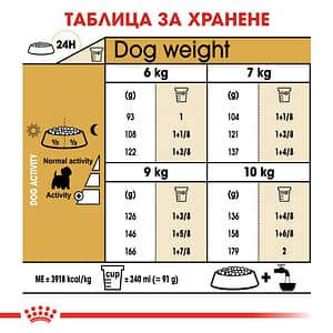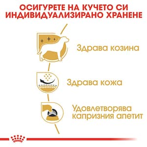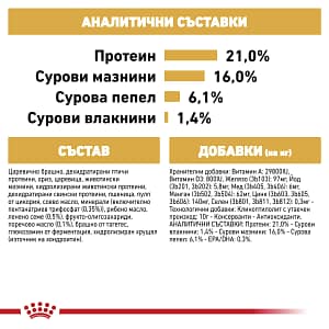 СЪСТАВ: царевично брашно, дехидратирани птичи протеини, ориз, царевица, животински мазнини, хидролизирани животински протеини, дехидратирани свински протеини, пшеница, пулп от цикория, соево масло, минерали (включително пентанатриев трифосфат (0,35%)), рибено масло, ленено семе (0,5%), фрукто-олигозахариди, поречово масло (0,1%), брашно от тагетес, глюкозамин от ферментация, хидролизиран хрущял (източник на хондроитин). ДОБАВКИ (на кг.): Хранителни добавки: Витамин A: 29800IU, Витамин D3: 800IU, Желязо (3b103): 97мг, Йод (3b201, 3b202): 5,8мг, Мед (3b405, 3b406): 6мг, Манган (3b502, 3b504): 62мг, Цинк (3b603, 3b605, 3b606): 140мг, Селен (3b801, 3b811, 3b812): 0,3мг – Технологични добавки: Клиноптилолит с утаечен произход: 10г – Консерванти – Антиоксиданти. АНАЛИТИЧНИ СЪСТАВКИ: Протеин: 21,0% – Сурови влакнини: 1,4% – Сурови мазнини: 16,0% – Сурова пепел: 6,1% – EPA/DHA: 0,3%. УКАЗАНИЯ ЗА ХРАНЕНЕ: виж таблицата. За партидния номер, идентификационния номер на фабриката: вижте на опаковката. Най-добър преди: вижте на опаковката. Да се съхранява на сухо и прохладно място.