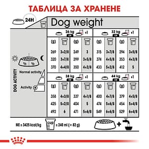 СЪСТАВ: царевица, дехидратиран птичи протеини, пшеница, царвичен глутен, растителни влакнини, хидролизирани животински протеини, животински мазнини, пшеничен глутен*, пулп от цвекло, рибено масло, мая и части от нея, соево масло, минерали, люспи и семена от псилиум, поречово масло, глюкозамин от ферментация, брашно от тагетес, хидролизиран хрущял (източник на хондроитин). ДОБАВКИ (на кг.): Хранителни добавки: Витамин A: 24000IU, Витамин D3: 1100IU, Желязо (3b103): 35мг, Йод (3b201, 3b202): 3,6мг, Мед (3b405, 3b406): 11мг, Манган (3b502, 3b504): 46мг, Цинк (3b603, 3b605, 3b606): 135мг, Селен (3b801, 3b811, 3b812): 0,06мг, L-карнитин: 200мг – Технологични добавки: Клиноптилолит с утаечен произход: 10г – Консерванти – Антиоксиданти. АНАЛИТИЧНИ СЪСТАВКИ: Протеин: 28,0% – Сурови влакнини: 6,7% – Сурови мазнини: 13,0% – Сурова пепел: 5,8%. УКАЗАНИЯ ЗА ХРАНЕНЕ: виж таблицата. За партидния номер, идентификационния номер на фабриката: вижте на опаковката. Най-добър преди: вижте на опаковката. Да се съхранява на сухо и прохладно място.