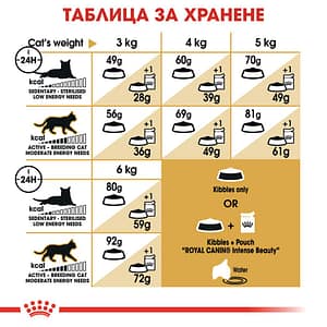 СЪСТАВ: дехидратирани птичи протеини, животински мазнини, ориз, пшеничен глутен*, царевичен глутен, хидролизирани животински протеини, царевица, растителни влакнини, дехидратирани свински протеини, пшеница, пулп от цвекло, продукти от мая, минерали, рибено масло, изсушен доматен пулп (източник на ликопен), соево масло, фрукто- олигозахариди, дрожди (източник на мано-олигозахариди), поречево масло, брашно от тагетес. ДОБАВКИ (на кг): Хранителни добавки: Витамин A: 32400IU, Витамин D3: 866IU, Таурин: 2.9г, Желязо (3b103): 35мг, Йод (3b201, 3b202): 3.5мг, Мед (3b405, 3b406): 11мг, Манган (3b502, 3b504): 45мг, Цинк (3b603, 3b605, 3b606): 134мг, Селен (3b801, 3b811, 3b812): 0,09мг – Технологични добавки: Клиноптилолит с утаечен произход: 10г – Антиоксиданти. АНАЛИТИЧНИ СЪСТАВКИ: Протеин: 33.0% – Сурови влакнини: 4.9% – Сурови мазнини: 23.0% – Сурова пепел: 7,4% – Омега-6 мастни киселини: 4,7%- Омега-3 мастни киселини: 1%- EPA/DHA: 0.4%- L -карнитин: 50мг/кг. УКАЗАНИЯ ЗА ХРАНЕНЕ: виж таблицата. За партидния номер, идентификационния номер на фабриката: вижте на опаковката. Най-добър преди: вижте на опаковката. Да се съхранява на сухо и прохладно място.