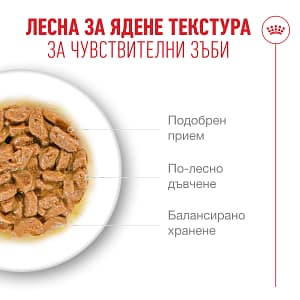 ROYAL CANIN® Ageing 11+ хапки в сос е мокра храна, подходяща за котки на възраст от 11 и повече години. Създадена за и изпитана с котки в напреднала възраст, храната ROYAL CANIN® Ageing 11+ хапки в сос е лесна за консумация текстура, която осигурява на твоята котка приятно изживяване по време на хранене. Тази формула, съдържаща нашия комплекс HealthyAge7™, осигурява прецизна хранителна смес, предназначена да помогне за поддържането на седем ключови аспекта на здравето и жизнеността при котките в напреднала възраст: Апетит и тегло: Изключително вкусна и богата на енергия храна, която поддържа здравословен апетит и помага за поддържане на идеално тегло. Храносмилане: Съдържа пребиотични фибри и лесносмилаеми протеини за подпомагане на здравословното храносмилане. Подвижност: