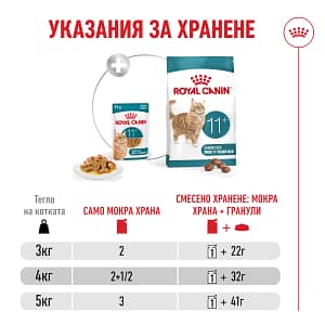 Съдържа EPA и DHA и хондроитин, които подпомагат здравето на ставите и подвижността. Кожа и козина: Съдържанието на линолова киселина и цинк спомага за поддържане на здравето на кожата и козината. Бъбреци: Съдържа висококачествен протеин и адаптирани нива на фосфор за подпомагане на здравето на бъбреците. Мозък и зрение: Съдържа триптофан, EPA и DHA, таурин и витамин А за подпомагане на когнитивната функция и зрението. Имунитет: Съдържа витамините C и E, лутеин, таурин, бета-каротен и ликопен, които подпомагат имунната система. ROYAL CANIN® Ageing 11+ се предлага в различни текстури, включително мек мус и като диета със сухи гранули.