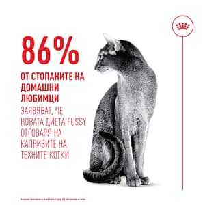 ROYAL CANIN® Fussy е нашата изключително вкусна гама от продукти, специално разработена за котки, които отказват всяка храна. Храненето на претенциозни котки може да бъде предизвикателство, а нашата ефективна формула предлага просто решение. Тази специално разработена диета е хранително балансирана и изключително апетитна, със специална комбинация от аромати и хрупкава текстура на гранулите.