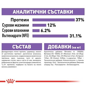 СЪСТАВ: дехидратирани птичи протеини, царевица, пшеничен глутен*, растителни влакнини, животински мазнини, хидролизирани животински протеини, ориз, пшеница, пулп от цвекло, царевичен глутен, продукти от мая, минерали, рибено масло, фрукто- олигозахариди, соево масло. ДОБАВКИ (на кг): Хранителни добавки: Витамин A: 19000IU, Витамин D3: 1000IU, Желязо (3b103): 31мг, Йод (3b201, 3b202): 3,1мг, Мед (3b405, 3b406): 9мг, Манган (3b502, 3b504): 40мг, Цинк (3b603, 3b605, 3b606): 94мг, Селен (3b801, 3b811, 3b812): 0,05мг – Технологични добавки: Клиноптилолит с утаечен произход: 10г – Зоотехнически добавки: Амониев хлорид: 5г – Антиоксиданти. АНАЛИТИЧНИ СЪСТАВКИ: Протеин: 37,0% – Сурови влакнини: 6,0% – Сурови мазнини: 12,0% – Сурова пепел: 8,5% – L-карнитин: 100мг/кг. УКАЗАНИЯ ЗА ХРАНЕНЕ: виж таблицата. За партидния номер, идентификационния номер на фабриката: вижте на опаковката. Най-добър преди: вижте на опаковката. Да се съхранява на сухо и прохладно място.
