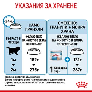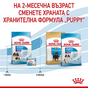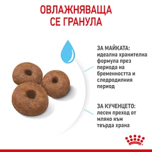 Формулата ROYAL CANIN® Giant Starter Mother & Babydog е специално разработена, за да отговори на хранителните изисквания на женските кучета и техните кученца. Тази формула е подходяща за женски кучета от гигантски породи с тегло в зряла възраст над 45 кг и за кученца в период на отбиване до 2 месечна възраст. Тази формула е специално адаптирана, за да отговори на повишените енергийни нужди на вашето много куче от едра порода, като същевременно подпомага развитието на кърмени кученца, включително когато са част от многобройни кучила. Съдържа и комплекс от хранителни вещества, включително витамини С и Е, с доказано действие в подкрепа на здравословното развитие на имунната система. Тази формула включва полезни пребиотици и високосмилаеми протеини, които помагат за поддържане на здравословен баланс на чревната микробиота за правилно храносмилане. Формулата ROYAL CANIN® Giant Starter Mother & Babydog е обогатена с омега-3 мастни киселини за подпомагане на здравословното развитие на мозъка при подрастващи кученца. Гранулите ROYAL CANIN® Giant Starter Mother & Babydog лесно се овлажняват с вода като могат да образуват апетитна каша, която е идеална за отбиване на кученца. Само след 8 седмици кученцата ще се нуждаят от храна, специално адаптирана, за да отговори на хранителните им нужди в следващия етап от развитието. На този етап можете да преминете към формула ROYAL CANIN® Giant Puppy, предлагана като суха храна, която помага за поддържане на високия темп на растеж.