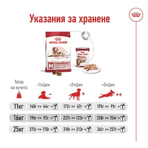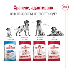 За кучета в напреднала възраст над 10 години, ROYAL CANIN® Medium Ageing 10+ е пълноценна и балансирана формула, специално разработена да посрещне нуждите на вашето куче от средна порода и да ги поддържа през годините на напредналата му възраст. Предназначена за кучета от средни породи, които тежат между 11 и 25 кг, тази формула е обогатена с основни витамини и хранителни вещества като oмега-3 мастните киселини EPA и DHA, за да помогне на вашето куче да се радва на жизненост през целия си живот и цялостно здраве. Кучетата в напреднала възраст разчитат на редовна физическа активност за правилното развитие на мускулите. Със своето специализирано висококачествено протеиново съдържание, тези гранули са създадени, за да помогнат на вашето остаряващо куче да поддържа мускулната си маса. Активният начин на живот на вашето куче в напреднала възраст може да го изложи на различни влияния от околната среда, които могат да отслабят имунната му система. Тази формула съдържа пребиотици и микс от витамини, включително витамини С и Е, за подпомагане на естествената му защита. Ние съобразихме формата и размера, за да отговаря на уникалната челюст и хранително поведение на вашето остаряващо куче. Тези специално изработени гранули помагат да насърчавате своето куче в напреднала възраст да дъвче старателно храната си. ROYAL CANIN® Medium Ageing 10+ се предлага и като мокра храна – хапки в сос. Сетивният капацитет на вашето куче може да намалее с напредване на възрастта, така че смесването на мокра и суха храна може да помогне за подобряване на вкуса на храната му.