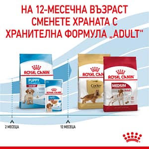 Формулата ROYAL CANIN® Medium Puppy е специално разработена, за да отговори на хранителните изисквания на кученцата от от средни породи. Тази формула е подходяща за кученца на възраст между 2 и 12 месеца, с очаквано тегло в зряла възраст от 11 – 25 кг. Тази адаптирана формула съдържа хранителни вещества като витамини С и Е, с доказано действие в подкрепа на здравословното развитие на имунната система на кученцата. Обогатена е с омега-3 мастни киселини (като DHA), за които е научно доказано, че подпомагат здравословното развитие на мозъка при кученцата. Сместа от полезни пребиотици (като фрукто-олигозахариди, мано-олигозахари и пулп от цвекло) и високосмилаеми протеини помагат за поддържане на здравословен баланс на чревната микробиота за правилно храносмилане. Формулата също така осигурява оптимално енергийно съдържание, за да отговори на енергийните нужди на растящите кученца от средни породи. Гранулите ROYAL CANIN® Medium Puppy са разработени да бъдат достатъчно големи, за да не стимулират вашето кученце да гълта храната без да я сдъвква, но не толкова големи, че да предизвикат отказ при хранене. Механичният ефект на четкане, създаден по време на дъвчене, допринася за поддържането на здравето на зъбите. Когато вашето кученце достигне 12-месечна възраст, то ще се нуждае от храна, специално адаптирана, за да отговори на хранителните му нужди като възрастен. На този етап можете да преминете към формулата ROYAL CANIN® Medium Adult, която се предлага в сух и мокър вариант (хапки в сос).