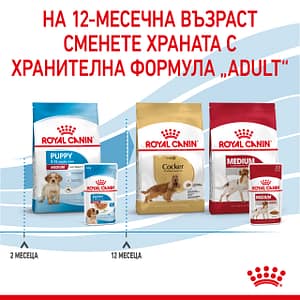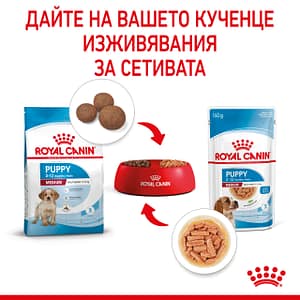 Формулата ROYAL CANIN® Medium Puppy (хапки в сос) е специално разработена, за да отговори на хранителните изисквания на средно големи кученца. Тази формула е подходяща за кученца на възраст между 2 и 12 месеца с очаквано тегло в зряла възраст 11 – 25 кг. Тази адаптирана формула съдържа апетитни хапки в сос с размер, текстура и вкус, които са идеални за подрастващи кученца от средни породи. Тази формула съдържа хранителни вещества като витамини С и Е за подпомагане на естествените защитни сили на кученцата, докато имунната им система все още се развива. Формулата е обогатена и с омега-3 мастни киселини (като DHA), за които е научно доказано, че подпомагат здравословното развитие на мозъка при кученцата. Благодарение на комбинацията от полезни пребиотици и високосмилаеми протеини, ROYAL CANIN® Medium Puppy (хапки в сос) също допринася за поддържането на здравословен баланс на чревната микробиота за правилно храносмилане. Формулата ROYAL CANIN® Medium Puppy (хапки в сос) осигурява на вашето кученце положително сензорно изживяване, помага за поддържане на здравословни нива на хидратация и е идеална за смесено хранене в комбинация със суха формула ROYAL CANIN® Medium Puppy. Когато вашето кученце достигне 12-месечна възраст, то ще се нуждае от храна, специално адаптирана, за да отговори на хранителните му нужди като възрастен. На този етап можете да преминете към формулата ROYAL CANIN® Medium Adult, предлагана както като суха храна, така и като мокра храна – хапки в сос.