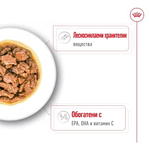 СЪСТАВ: месо и животински продукти, зърнени култури, масла и мазнини, продукти с растителен произход, минерали, дрожди. ДОБАВКИ (на кг.): Хранителни добавки: Витамин D3: 240IU, Витамин С: 90мг, Желязо (3b103): 8мг, Йод (3b202): 0,13мг, Мед (3b405, 3b406): 1мг, Манган (3b502, 3b503, 3b504): 2,4мг, Цинк (3b603, 3b605, 3b606): 24мг – Технологични добавки: Клиноптилолит с утаечен произход: 2г. АНАЛИТИЧНИ СЪСТАВКИ: Протеин: 8,0% – Сурови влакнини: 0,8% – Сурови мазнини: 5,2% – Сурова пепел: 1,5% – Влага: 81,1% – EPA/DHA: 0,04%. УКАЗАНИЯ ЗА ХРАНЕНЕ: виж таблицата. За партидния номер, идентификационния номер на фабриката: вижте на опаковката. Най-добър преди: вижте на опаковката. Да се съхранява на сухо и прохладно място. По всяко време трябва да има вода на разположение.