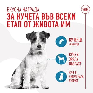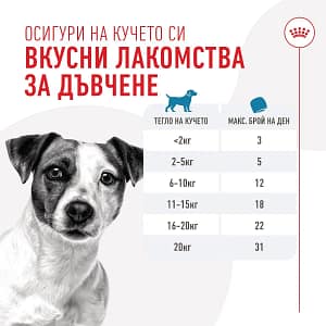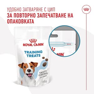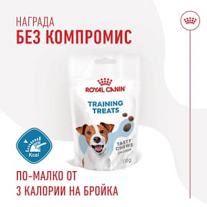 ROYAL CANIN® Training Treats са разработени от ветеринарни лекари и одобрени от кучета. Тези лакомства представляват научно-разработен микс от съставки, основан на изследвания и наблюдения в областта на храненето на кучетата в продължение на над 50 години. Независимо дали обучавате кучета на основни команди или на сложни трикове, лакомствата за обучение ROYAL CANIN® предлагат перфектния баланс между вкус и хранителни вещества. ROYAL CANIN® Training Treats съдържат DHA, както и витамините С и Е, за да подпомогнат здравословното функциониране на мозъка от периода на кутрето до късните му години. С по-малко от 3 калории на бройка, тези нискокалорични лакомства са предназначени да поддържат здравето на вашето куче, като същевременно възнаграждават доброто му поведение. Нашите лакомства за обучение са предназначени да допълват всеки хранителен режим от гамата на ROYAL CANIN®, предназначена за здрави домашни любимци над 6-месечна възраст. Не забравяйте да следвате указанията за хранене, посочени на опаковката, и да давате на кучето си не повече от препоръчителния брой лакомства на ден.