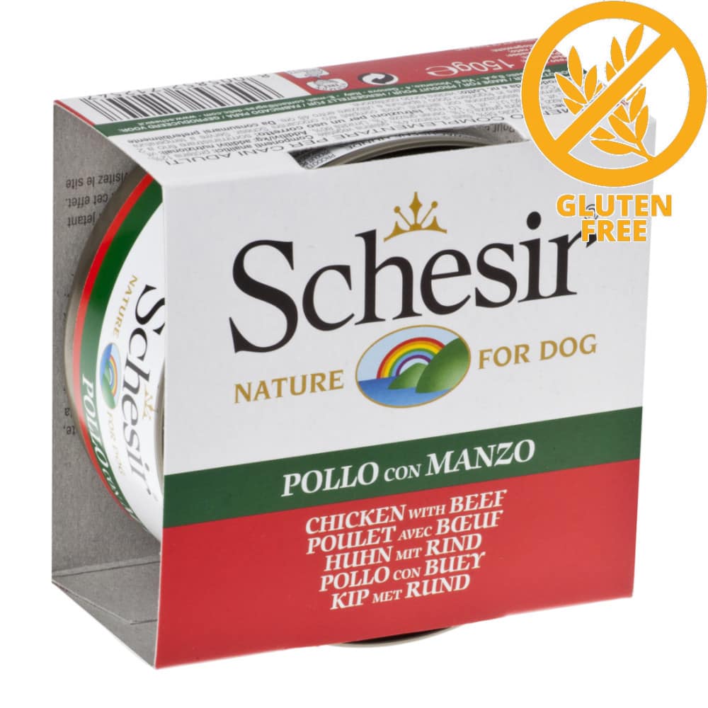 Schesir Dog Chicken Fillets with Beef -Пилешки филенца и говеждо в желе- консерва за кучета 150гр