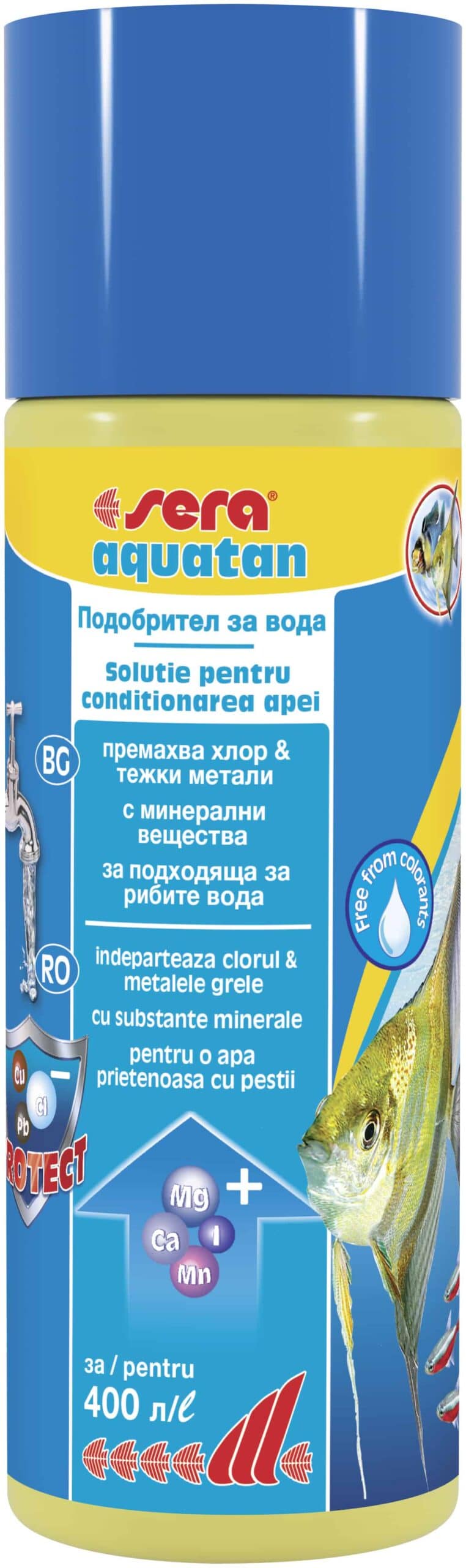 Sera Aquatan – Подобрител за вода, подходяща за рибите, богата на минерални вещества. незабавно премахва хлора и хлорамините; свързва тежки метали; с минерални вещества . Токсични вещества като хлор и тежки метали могат да попаднат във водата на аквариума при всяка смяна на водата. Дори добре тестваната питейна вода често съдържа тези вещества в концентрации, които са критични за рибите и другите обитатели на аквариума. Sera Aquatan незабавно превръща чешмяната вода в аквариумна вода. Премахва вредните вещества като хлор и хлорамини, свързва тежки метали (например мед, цинк или олово) и предпазва от амоняк. В същото време в аквариумната вода се добавят важни минерални вещества в бионалична форма, което е в полза на риба, растения, безгръбначни и полезни микроорганизми: Калций за силен, добре пропорционален скелет и безупречни люспи; Магнезий за силен растеж и мускули; Манган за здравословен растеж и подобряване на плодовитостта; Йод за балансирано развитие и по-добра устойчивост на болести. Така препаратът осигурява оптимални условия на живот за всички обитатели на аквариума. Sera Aquatan осигурява вода, щадяща рибите, чрез премахване на токсичния амоняк и хлора. Тези замърсители са вредни и евентуално фатални както за рибите, така и за скаридите, дори в ниски концентрации. Диаграмата обобщава, кога рибите и/или скаридите са в опасност. Aquatan е в състояние да премахне или свърже тези замърсители изцяло в най-кратки срокове (10 минути максимум) и по този начин предпазва обитателите на аквариума от опасни интоксикации.