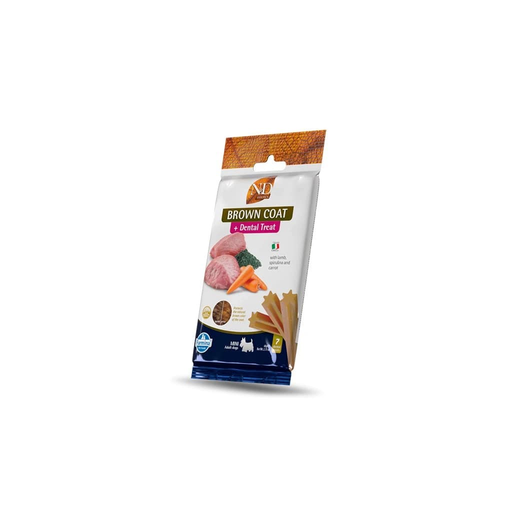 Допълваща храна за кучета над 4 месечна възраст. Дентално лакомство за мини кучета с кафява козина – със спирулина, агнешко и моркови.