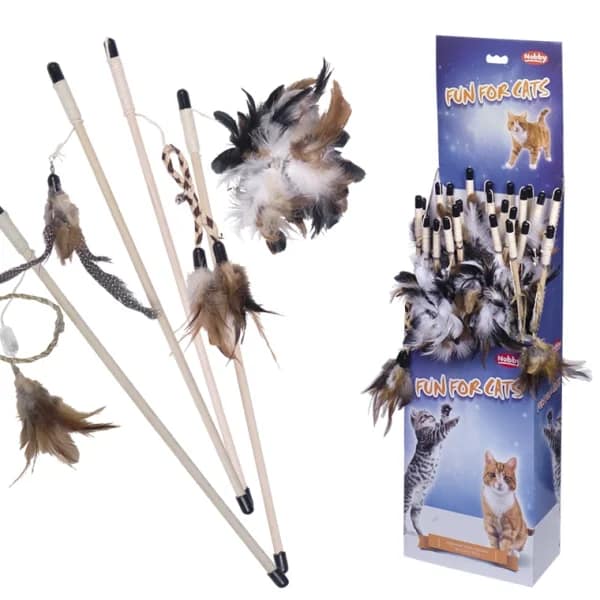 Вълнуващи играчки за вашата котка: Тази въдица се състои от пластмасова пръчка с въже и играчка с пера.